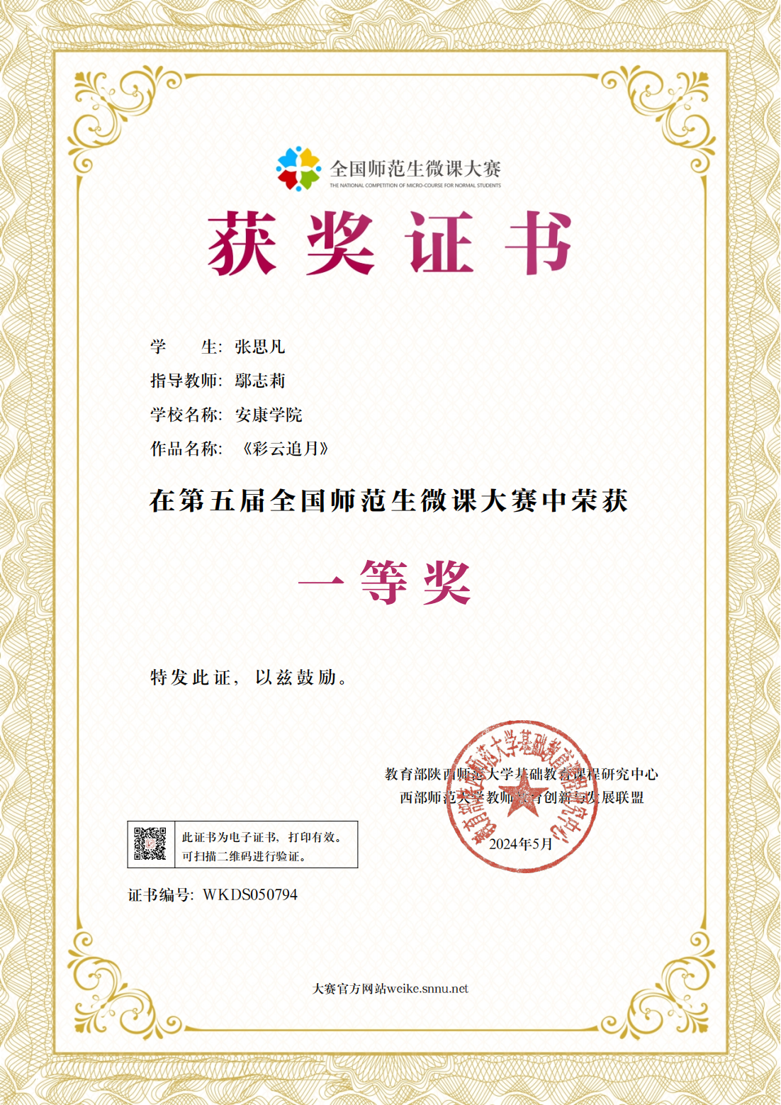 张思凡同学获得全国微课大赛一等奖