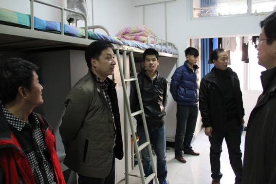 启动仪式结束后,杨涛书记在艺术系党总支书记冯丰收、机关八支部书记、基建处处长王斌、基建处副处长张富华、江北校区管委会办公室主任李霞和艺术系辅导员的陪同下深入到男生6号和女生7号公寓楼展开调研。在宿舍杨书记向大二大三同学了解了宿舍管理的情况,问同学们现在在管理方面还需要公司解决哪些问题?对员工党小组进宿舍还有哪些好的建议;问大一新生适应不适应公司环境,生活上还有哪些困难……。所到之处,杨书记与师生谈笑风生,同学们也无拘无束、踊跃地向领导汇报了自己的学习、生活、思想方面的情况。