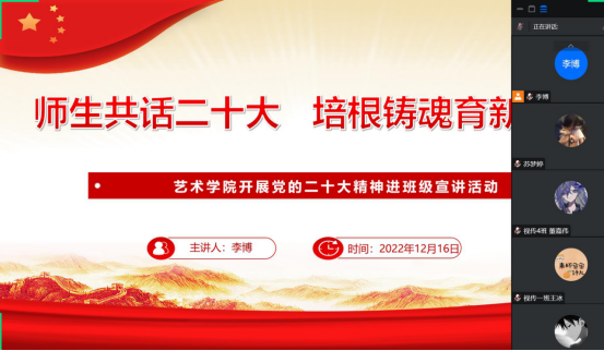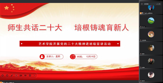 为深入学习宣传贯彻党的二十大精神,把全院师生的思想统一到党的二十大精神上来,落实立德树人的根本任务。根据《中共k1体育官方网站委员会关于认真学习宣传贯彻党的二十大精神的通知》,k1体育分别于12月16日至20日期间,组织开展了“师生共话二十大 培根铸魂育新人”党的二十大精神进班级宣讲活动。全体辅导员走进班级,开展“党的二十大精神”主题云宣讲会,引导公司学子进一步了解大会精神,把握核心要义,深入推进党的二十大精神入脑入心。