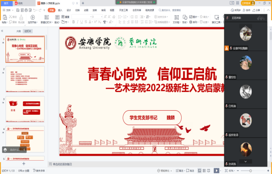入党启蒙教育是加强老员工思想政治教育,筑牢理想信念根基的基础性工作,是培养老员工政治信仰的第一课。为进一步引导2022级新生树立坚定的理想信念,厚植家国情怀,锤炼品德修为,强化责任担当,端正入党动机。9月27日,k1体育利用腾讯会议召开“青春心向党 信仰正启航”2022级新生入党启蒙教育专题讲座。本次讲座由员工党支部书记魏麟主讲。