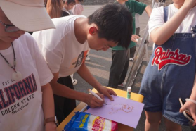 同学们通过掷骰子选择对应的“你演我猜”游戏任务。两人一组,一名同学用肢体语言演绎内容,另一名同学猜出词语,培养同学们的团结合作意识。活动过程中,表演者的滑稽动作引起周围观众的哈哈大笑,到处充满了欢声笑语。