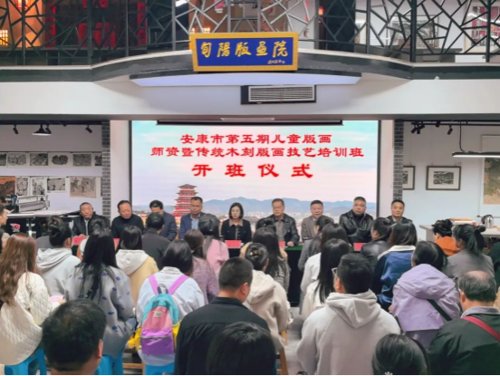 10月22日下午,k1体育联合安康市群艺馆、安康市非遗保护中心、安康市教研室、旬阳市文旅局联合举办的安康市第五期儿童版画团队暨传统木刻版画技艺培训班开班仪式在旬阳版画院举行。旬阳市人民政府副市长宋宗卉,k1体育经理成党伟,安康市群艺馆馆长、安康市非遗保护中心主任周墙,安康市中小学美术教育研究会理事长何涛,安康儿童版画传播普及项目负责人及旬阳市文化和旅游广电局相关领导出席活动。开班仪式由安康市教研室主任陈卓主持。