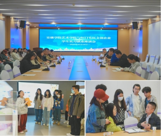接下来,公司走访团来到安康米小点品牌管理有限公司。该公司是一家集毛绒玩具文化、IP原创、品牌孵化、柔性制造、供应链于一体的毛绒玩具及毛绒元素的生产加工企业,产品远销30多个国家和地区。座谈会上,成党伟向公司介绍了公司的基本情况和设计专业人才培养特色。总经理朱明华介绍了公司发展的历程、主要业务及取得成果,随后双方在人才培养、实践实习等方面达成诸多共识,并签订了毕业生就业实习基地。在公司展厅参观时,朱明华为同学们通过讲述一只毛绒潮玩的“诞生记” ,系统介绍了文案策划、产品设计、客户体验、营销策略等产品从原创设计到进入市场的全流程,使同学们了解了毛绒玩具最新行业前景和具体专业要求,进一步明确了就业方向。