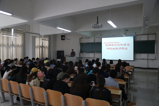孙海洋副经理向同学们传达了《陕西省教育厅关于印发<陕西省《中小学救团队格考试暂行办法》实施细则(试行)>的通知》(陕教规范[2014]13号)文件精神,对k1体育官方网站教字[2018]11号文件中关于师范专业教师职业能力测评进行了宣讲。