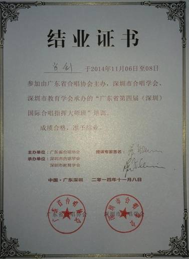 11月5日至9日,我系肖剑老师应邀参加广东省(深圳)第四届国际合唱指挥大师班,并在此次大师班学习中受到林恩·威廉姆教授的亲手指导,并顺利通过考核,取得结业证书。