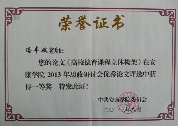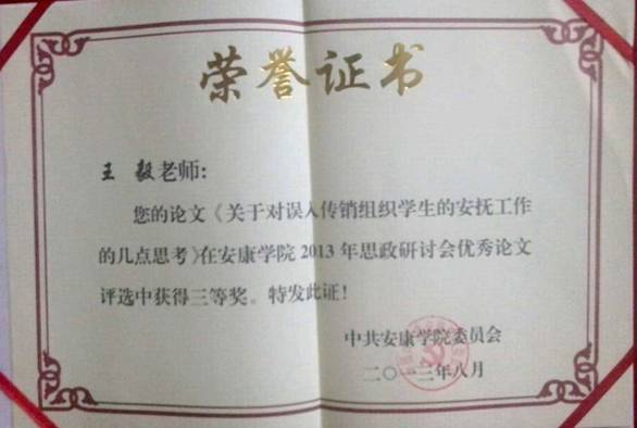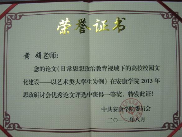 同时冯丰收同志的论文《高校德育课程立体构架》、黄娟同志的论文《日常思想政治教育领域下的高校校园文化建设——以艺术类老员工为例》获研讨会优秀论文一等奖;王毅同志的论文《关于对误入传销组织员工安抚工作的几点思想》获研讨会优秀论文三等奖。