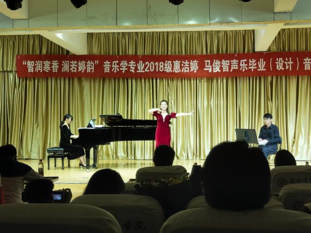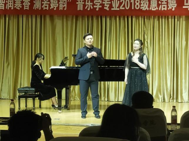 惠洁婷同学共演唱了6首声乐作品,其中《一杯美酒》是一首中国维吾尔族歌曲,歌词优美,旋律奔放,表达了对维吾尔族人民的热爱,惠洁婷同学载歌载舞的表演,更是将音乐会推向了高潮。
