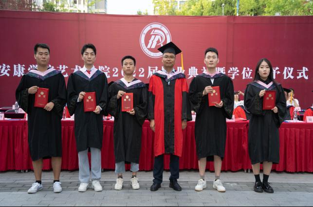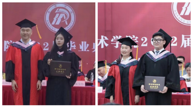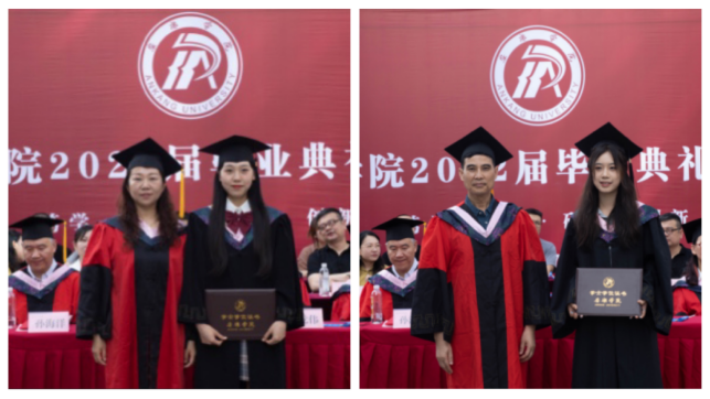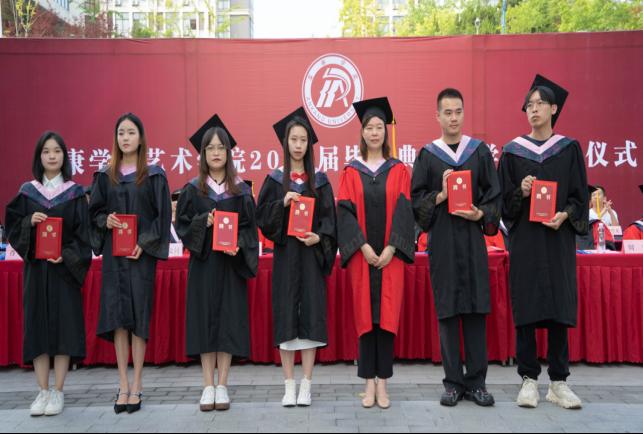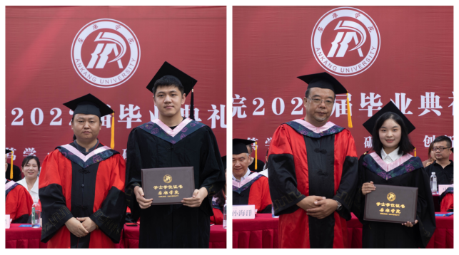 伴随着歌声,公司经理成党伟教授和导师们为毕业生们一一正冠拨穗,颁发学位证书,并合影留念。