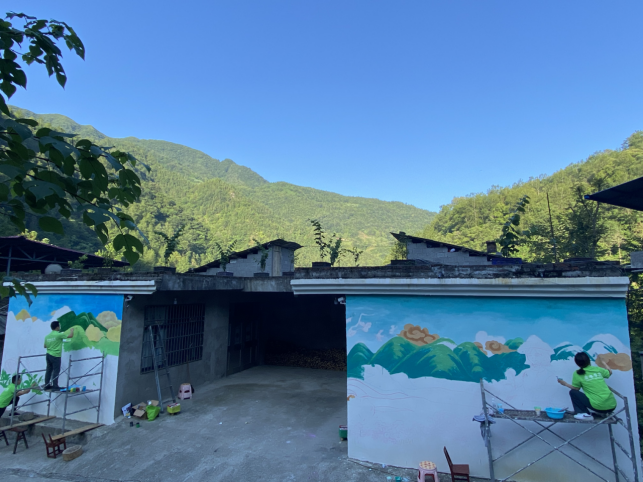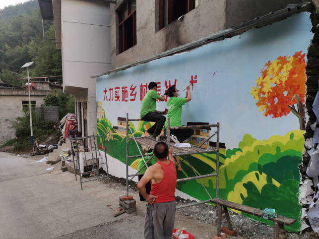7月25—26日,院领导成党伟经理亲临现场指导,看到干劲十足的队员们,主动要求承担保障工作、接送队员、上色勾线。通过队员们的起早贪黑、顶着烈日的不懈努力,采茶图、丰收图和乡村振兴图终于大功告成,精美的画面、绚烂的色彩成为了村庄一道美丽的风景线,营造了文化氛围、提升了村庄风貌、激发了乡村活力,受到镇村领导和村民们的一致好评。