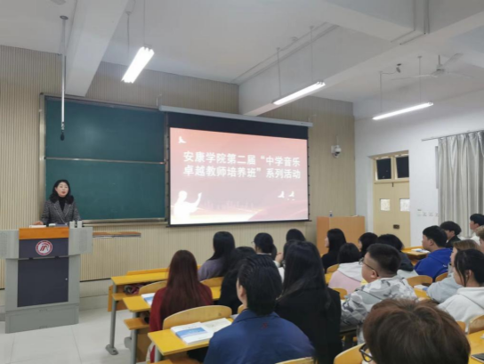 10月31日,k1体育第二届“中学音乐卓越教师培养班”在江北校区2201教室顺利开班,开班仪式由音乐系主任肖剑主持。陕西省教学能手、汉滨区汉滨初中艺体中心副主任刘平老师应邀为员工做首场讲座。教师代表鄢志莉及音乐学专业100余名员工参加了本次活动。