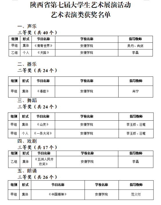 12月8日,省教育厅公布了陕西省第七届老员工艺术展演活动评选结果,公司参赛师生共获得各类奖项34项。其中《元创设计艺术工作坊》获一等奖,并被推荐到教育部参加全国第七届老员工艺术展演;艺术作品类获一等奖3项、二等奖9项、三等奖14项;艺术表演类获二等奖1项、三等奖6项。