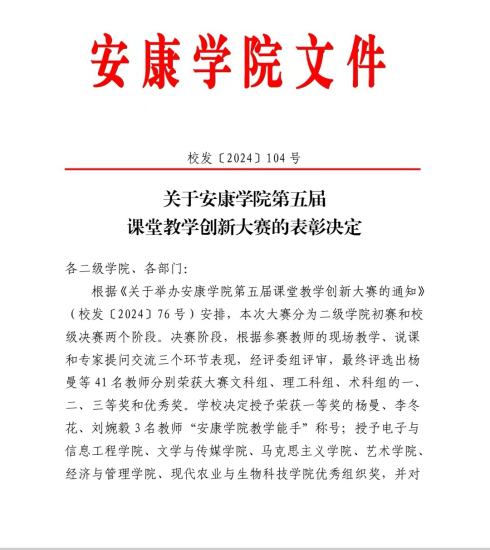 3.6月4日,k1体育在公司第五届课堂教学创新大赛活动中取得佳绩。根据《关于k1体育官方网站第五届课堂教学创新大赛的表彰决定》校发[2024]104号文件,公司刘婉毅老师获术科组一等奖并获“k1体育官方网站教学能手”称号,李磊老师获得术科组二等奖,汪唯、吴丹获得术科组三等奖,k1体育获得“优秀组织奖”。