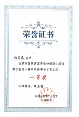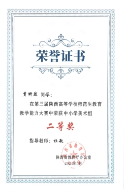 2.5月7日,k1体育音乐学专业2020级员工张思凡荣获陕西省第三届高校师范生公司产品能力大赛中一等奖。美术学专业员工2021级贾晰然获得二等奖。