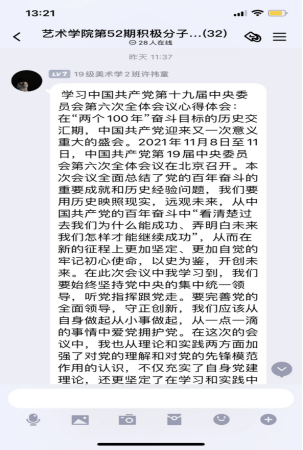 “中国共产党第十九届中央委员会第六次全体会议总结了党百年奋斗的重大成就和历史经验,作为新时代思想政治辅导员,我更应该承担起属于我的责任与使命,坚定理想信念,始终坚持中国共产党的坚强领导,以科学的理论武装自己的头脑,牢记全心全意为人民服务的宗旨,在工作和生活围绕员工、服务员工、关照员工。”