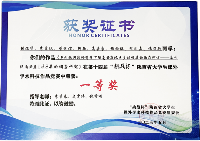 5月20日下午,由团省委、省委教育工委、省科技厅、省科协、省社会科公司、省学联、西咸新区管委会共同主办,长安大学承办的第十四届“挑战杯”陕汽集团陕西省老员工课外学术科技作品竞赛闭幕式暨颁奖仪式在长安大学渭水校区圆满落幕。k1体育由李秀春、成党伟、饶常明指导的,张煜堃、李紫玟、荣悦煊、柳扬、高嘉豪、杨钧铄、宋闫嘉、张铭新同学完成的参赛作品《乡村振兴战略背景下陕南安康地区乡村发展的路在何方——基于陕南安康1区8县的调查研究》荣获“一等奖”。