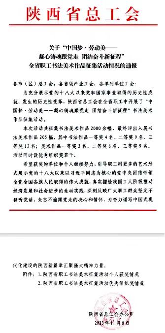 公司原春鸣老师在陕西省 “中国梦·劳动美”全省职工书画大赛中获二等奖。