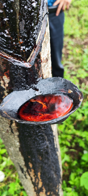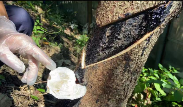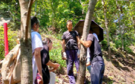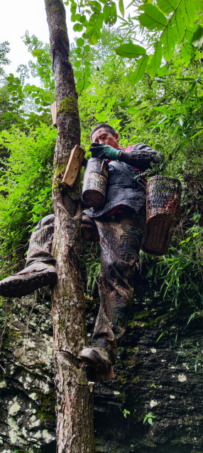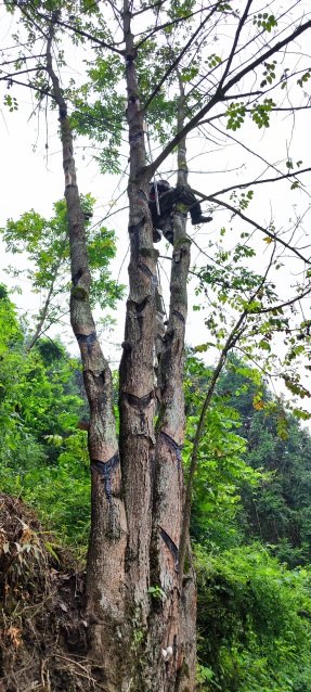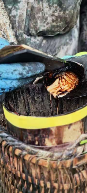 团队跟赴割漆师傅了解割漆与漆器制作工序,山路陡峭,割漆工人首先切割树皮形成V型创口,在创口正下插入采漆专用打磨过的贝壳用于收集漆树液,等待盛满后倒入漆桶。据了解,割漆工人最早便从凌晨1点上山割漆,待到五个小时以后便可收漆,我们也听到了当地关于龙王爷与漆树的民间传说。