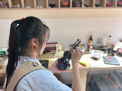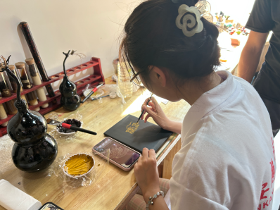 产业园传承人师傅对传统技艺产业发展的现状和未来与我们进行了探讨,并分享了其制作漆器的经验。我们和赵老师在专业传承人的指导下体验了漆器制作的上色工序,在观看到不同的漆器后,赵老师为大家详细地介绍了其中与我们国画创作中相通的表现手法,这更让大家对这门技艺有了亲切感,同时在欣赏了精美漆器后也深刻感悟到牛王生漆技艺的独特和古老,具有悠久的历史和独特的艺术价值。