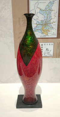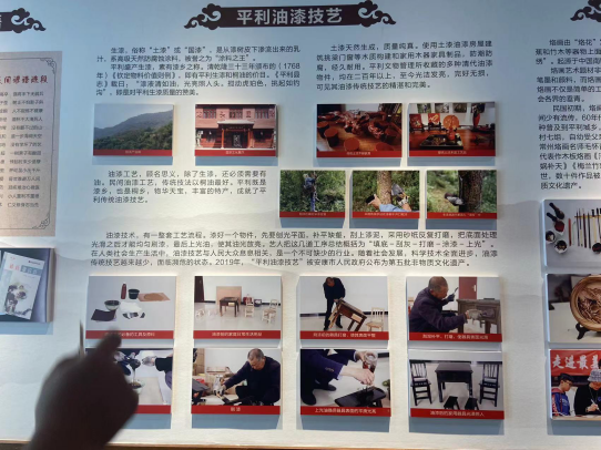 在前期文献查阅过程中,我们了解到早在清乾隆年间,以陕西省平利产地牛王沟而得名的“牛王漆”,以“漆液清如油,光亮照见头,搅动琥珀色,挑起如钓钩”为特点,被誉为“国漆”。2022年,平利牛王漆艺获批为陕西省非物质文化遗产保护项目。8月29日,我们赶赴平利县龙头村龙头国漆文化产业园进行考查,在工作人员何海林师傅的带领下,我们首先参观漆器博物馆内精美绝伦的漆器,何师傅向我们团队详细生动地介绍了漆艺品的制作过程。工艺精湛、绝美细腻的漆器艺术品让人眼花缭乱,在参观过程中栩栩如生的青绿山水漆画瓶与明亮平滑如镜的花纹镜底托盘给实践团队留下了极其深刻的印象,我们无不赞叹漆匠高超的手艺。面对漆艺品的造型和纹饰,大家也在思考将这些表现技法等融入到自己等专业表现之中。