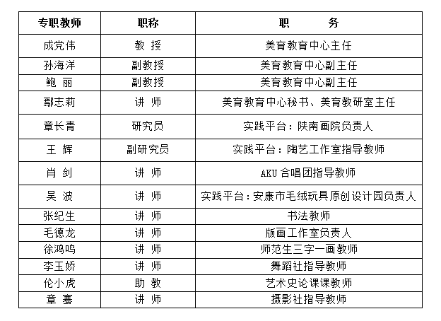 目前公司共有公共艺术类专职教师13人,其中高级职称5人,讲师职称7人,其中研究生以上学历8人,同时外聘教师10人:安康市群艺馆周墙研究员,安康市美协主席李剑平,美协副主席樊光矢、申小荣先生,安康知名书画名家张枫、何涛、王关棣,紫阳民歌传承人黄杰,二胡名家王伟权、张定柱。